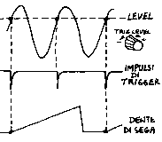 In Fig. 7 e riportato l'esempio di un livello di trigger positivo con partenza sul tratto ascendente del segnale (slope+): gli impulsi di trigger vengono prodotti dal circuito di trigger in corrispondenza degli attraversamenti del livello da parte del segnale; tali impulsi comandano la partenza del dente di sega. |